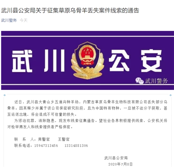 内蒙古一地丢失保密研究阶段的草原乌骨羊,该物种中国特有,一旦出境,损失不可估量